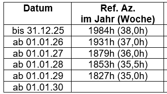Die GDL und die AVG haben im Tarifabschluss die Reduzierung der Referenzarbeitszeit von 1984 (38h/Woche) auf 1827 Stunden/Jahr (35h/Woche) für Beschäftigte in Schichtarbeit vereinbart. Die Absenkung auf die durchschnittliche 35-Stunden-Woche sollte stufenweise beginnend am 1. Januar 2025 bis zum Erreichen im Jahr 2028 erfolgen.