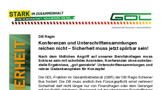 Die GDL-Fraktion im Gesamtbetriebsrat (GBR) der DB Regio Schiene/ Bus fordert: Die DB muss endlich ihre Fürsorgepflicht ernst nehmen! Sicherheit darf nicht länger nur von Finanzfragen oder dem Gerangel mit der Politik abhängen. Basierend auf der jahrelangen Beschäftigung mit dem Thema Sicherheit fordert die GDL mehrere Lösungsansätze, die auf fundierten wissenschaftlichen Erkenntnissen beruhen: