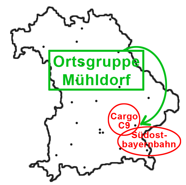 Hier unten haben wir uns versteckt und wie die Karte schon erahnen lässt, arbeiten die meisten unserer Mitglieder bei der Südostbayernbahn oder bei DB Cargo C9 in Mühldorf.