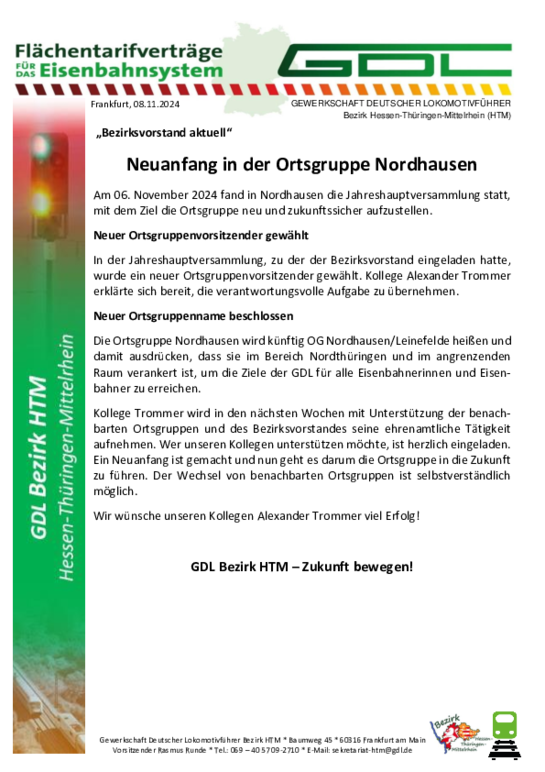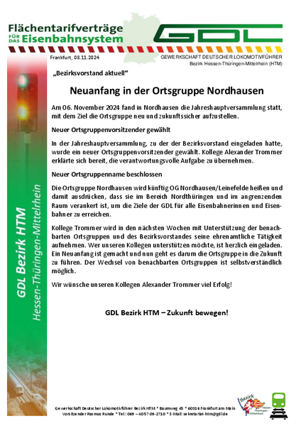 Die Ortsgruppe Nordhausen wird künftig OG Nordhausen/Leinefelde heißen und damit ausdrücken, dass sie im Bereich Nordthüringen und im angrenzenden Raum verankert ist, um die Ziele der GDL für alle Eisenbahnerinnen und Eisenbahner zu erreichen.