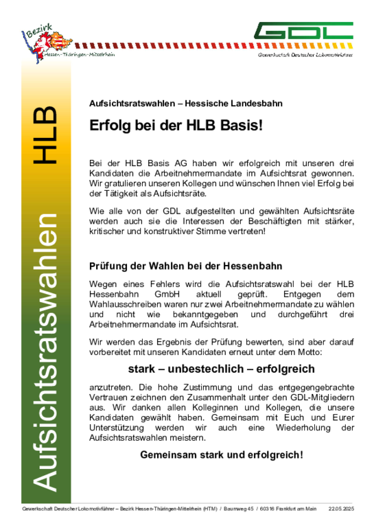 Wir als GDL für Euch und die Mitarbeiter der HLB. Das habt ihr erfolgreich gezeigt, als es galt die Tarifverträge der GDL bei der HLB durchzusetzen. Gehälter und Planungssicherheit wurden auf das Niveau aller Eisenbahnverkehrsunternehmen gebracht. Gemeinsam sind und bleiben wir Erfolgreich.