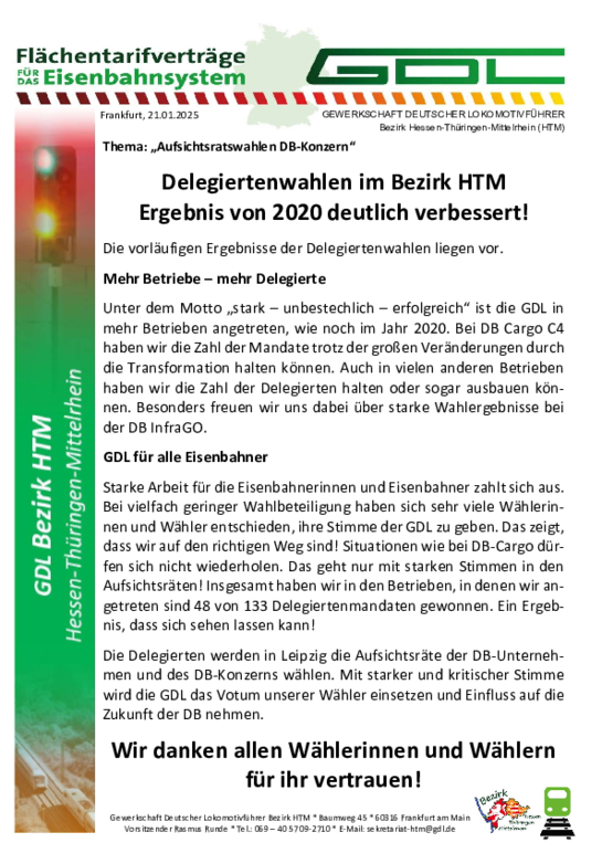 Die Kolleginnen und Kollegen des Bezirks HTM sagen hiermit “Danke” und freuen sich auf alle, die mit uns gemeinsam Leben und Arbeit bei der Eisenbahn verbessern wollen.