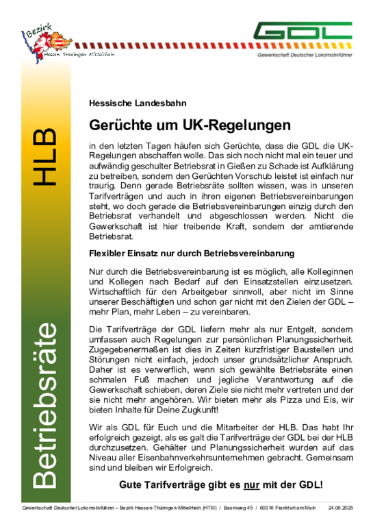 in den letzten Tagen häufen sich Gerüchte, dass die GDL die UK-Regelungen abschaffen wolle. Das sich noch nicht mal ein teuer und aufwändig geschulter Betriebsrat in Gießen zu schade ist, Aufklärung zu betreiben, sondern Gerüchten Vorschub leistet, ist einfach nur traurig. Denn gerade Betriebsräte sollten wissen, was in unseren Tarifverträgen und auch in ihren eigenen Betriebsvereinbarungen steht, wo doch gerade die Betriebsvereinbarungen einzig durch den Betriebsrat verhandelt und abgeschlossen werden. Nicht die Gewerkschaft ist hier treibende Kraft, sondern der amtierende Betriebsrat.