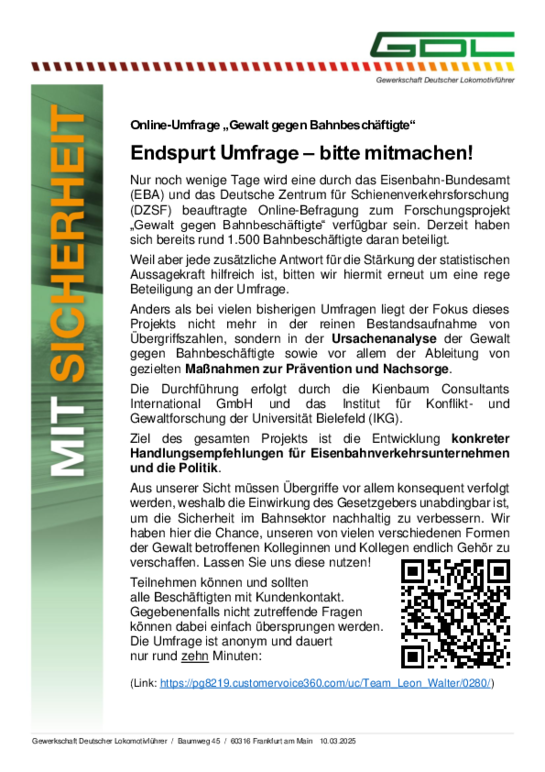 Nur noch wenige Tage wird eine durch das Eisenbahn-Bundesamt (EBA) und das Deutsche Zentrum für Schienenverkehrsforschung (DZSF) beauftragte Online-Befragung zum Forschungsprojekt „Gewalt gegen Bahnbeschäftigte“ verfügbar sein. Derzeit haben sich bereits rund 1.500 Bahnbeschäftigte daran beteiligt.