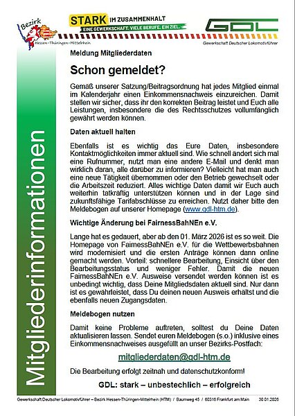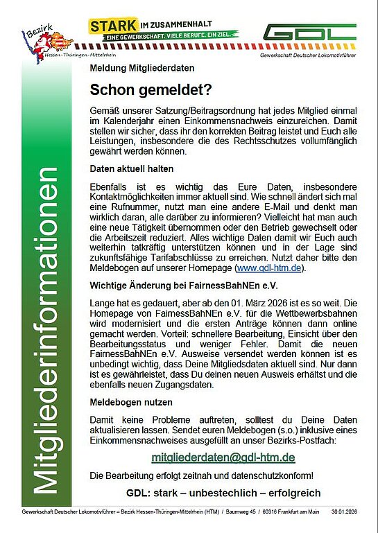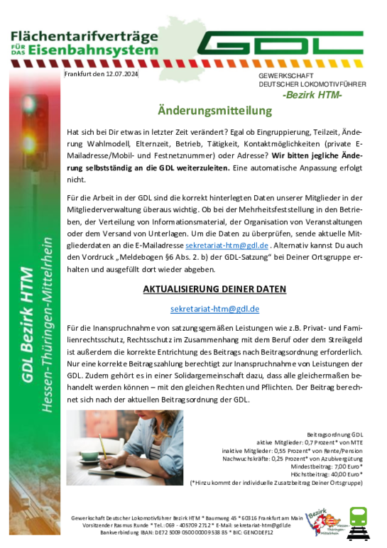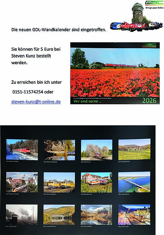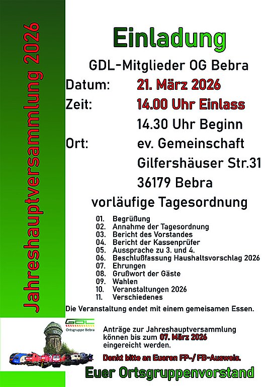 Herzlich Willkommen bei der GDL-Ortsgruppe Bebra. Hier finden Sie die Kontaktdaten unseres Vorstands sowie aktuelle Termine und wichtige Neuigkeiten aus der Ortsgruppe. In der Eisenbahnerstadt (Bebras erste Bahnlinie ist 1848 in Betrieb gegangen) vertreten wir unter anderem die Kollegen der DB (Cargo, Regio, InfraGO), Cantus sowie einiger kleinen regionalen Unternehmen.