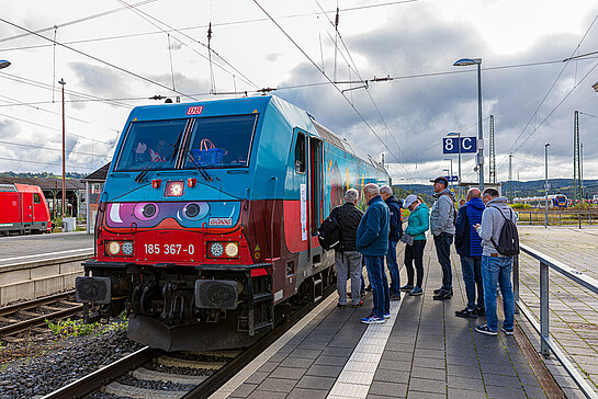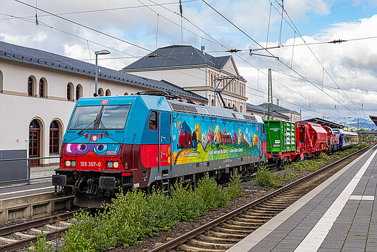 Von DB Cargo war neben zwei Güterwagen die Elok 185 367 "Günni Güterzug" ausgestellt