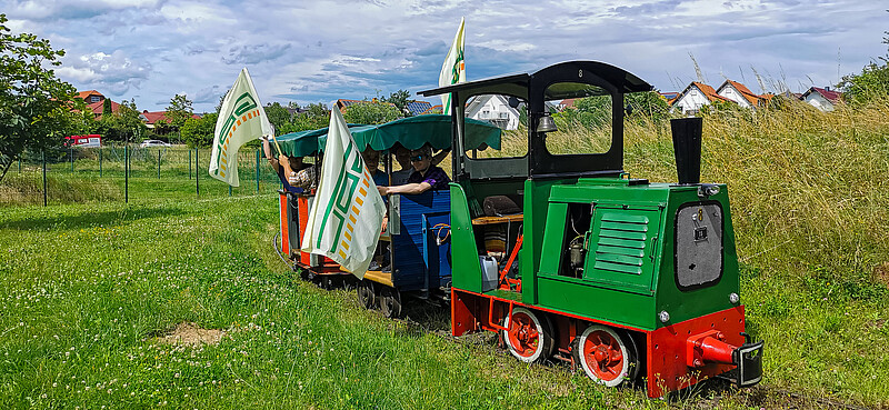 Die Feldbahn am Wasserturm fuhr auch dieses Jahr für unsere Mitglieder. Hier bei einer "Fahnensonderfahrt"