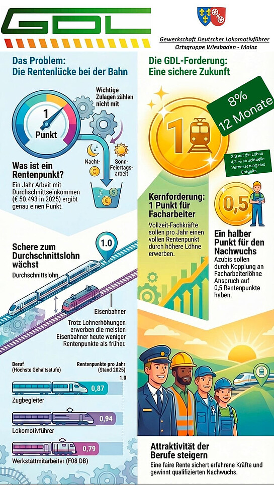 Am 28. September 2024 feierte die GDL-Ortsgruppe Wiesbaden-Mainz ihr 75-jähriges Jubiläum im Schützenhof in Wiesbaden-Biebrich. Rund 50 Mitglieder der Gewerkschaft Deutscher Lokomotivführer (GDL) sowie deren Angehörige nahmen an der festlichen Veranstaltung teil. Zur Eröffnung verlas Kassierer Viktor Neugebauer das Gründungsprotokoll (siehe unten) der Ortsgruppe. Der Ortsgruppenvorsitzende Michael Rösgen und sein Stellvertreter Markus Fahrein begrüßten herzlich die anwesenden Mitglieder und ihre Familien.