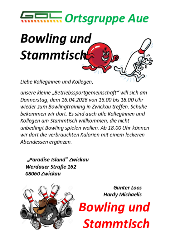 unsere kleine „Betriebssportgemeinschaft“ will sich am Donnerstag, dem 16.04.2026 von 16.00 bis 18.00 Uhr wieder zum Bowlingtraining in Zwickau treffen. Schuhe bekommen wir dort. Es sind auch alle Kolleginnen und Kollegen am Stammtisch willkommen, die nicht unbedingt Bowling spielen wollen. Ab 18.00 Uhr können wir dort die verbrauchten Kalorien mit einem leckeren Abendessen ergänzen.