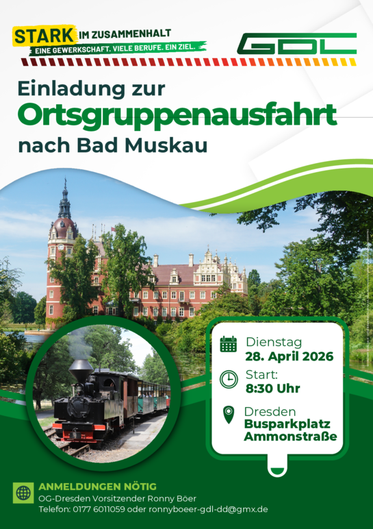 wir laden euch am 28. April 2026 herzlich zu unserer diesjährigen Ausfahrt der GDL-Ortsgruppe Dresden nach Bad Muskau ein.