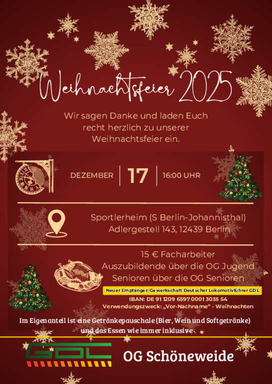 Dezember - 17.12.25 um 16:00 Uhr Weihnachtsfeier - im Sportlerheim (S-Bahnhof Johannisthal)