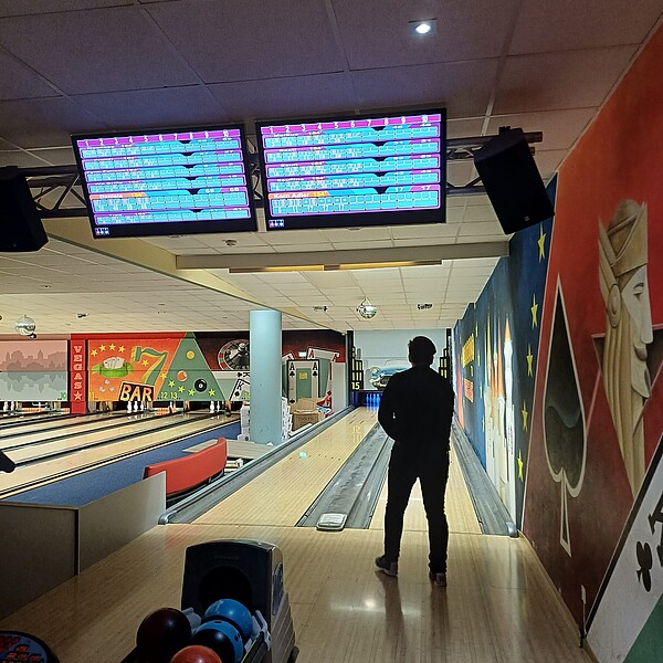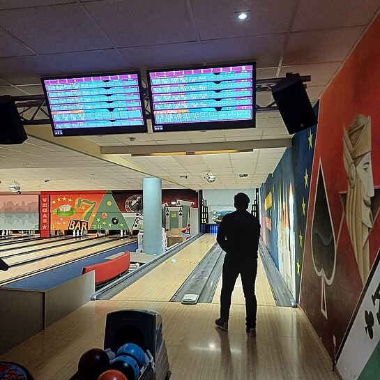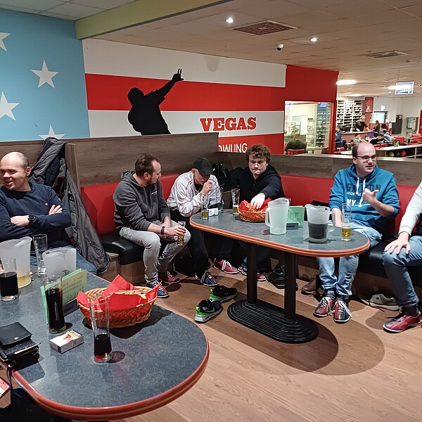 Eintrudeln der Kollegen und Kolleginnen war ab 14:15 Uhr und tatsächlich sind die ersten auch pünktlich erschienen. Nachdem alle da waren sind wir gemütlich zum Bowling gelaufen und haben uns in die Tiefen des Gebäudes zum Vegas Bowling begeben. Schuhe verteilen und uns auf Bahn 15 und 16 platziert. Mal die erste Runde Getränke bestellt und ab ging die flotte Runde.