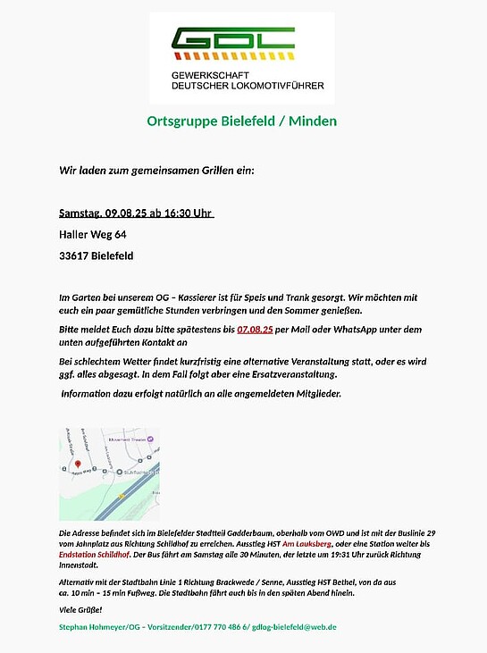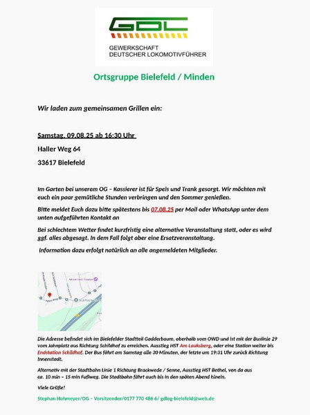 Die Ortsgruppe betreut alle GDL-Mitglieder im Bereich Bielefeld/Minden. Der ehrenamtliche Vorstand berät und betreut die Mitglieder, organisiert Mitgliederversammlungen und plant gesellige Veranstaltungen. Für alle Themen rund um die GDL ist dein Ortsgruppenvorstand die erste Adresse für dich als Mitglied.