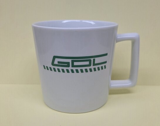 Lust auf einen Kaffee oder Tee? Aus kratzfestem Porzellan gefertigt und spülmaschinenfest, verfügt der handliche Becher (97 x 89 mm) mit 410 Milliliter Fassungsvermögen über eine große Füllmenge. Doch auch die Optik kommt nicht zu kurz: Der ausgefallene Henkel und das mittig platzierte grüne GDL-Logo machen den Becher zum echten Hingucker.