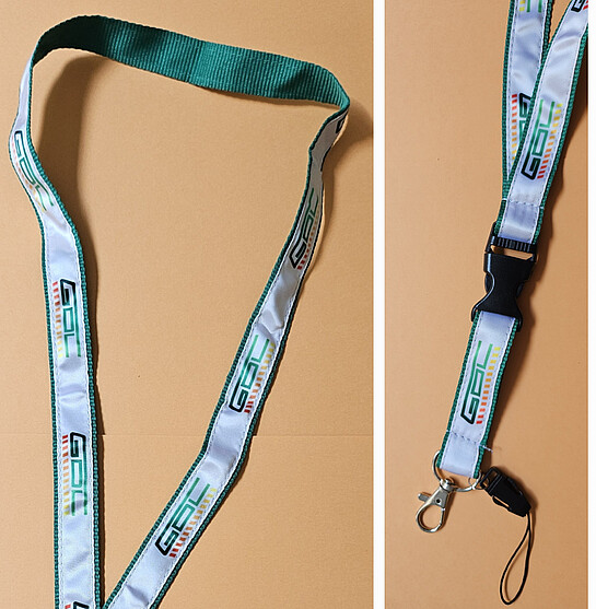 Praktischer geht es nicht. An unserem GDL-Schlüsselband können Sie Dank des Karabinerhakens und einem zusätzlichen Plastikclip sowie Handyschlaufe Ihre Schlüssel und andere Gegenstände schnell befestigen und ebenso schnell wieder entfernen. Das hochwertige 20 mm breite Schlüsselband ist aus einem grünen Unterband und einem mit farbigen GDL-Logos bedruckten Satinband gefertigt.