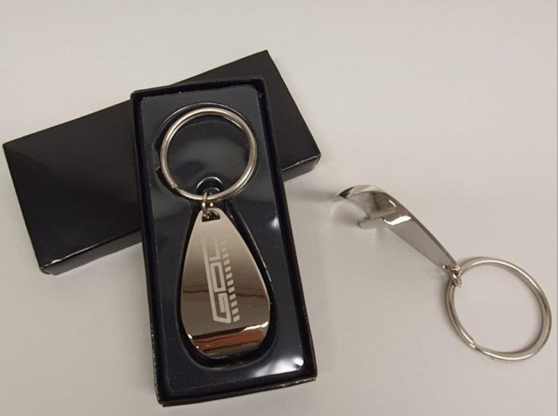 Gefertigt aus hochglänzendem Metall besticht der Flaschenöffner durch die prägnante Logo-Gravur. Mit Maßen von 5 x 2,8 x 1 cm ist er ein handlicher Begleiter. Besonders praktisch, da durch den großen Schlüsselring fast überall anzubringen. Verpackt in schwarzer Schachtel.