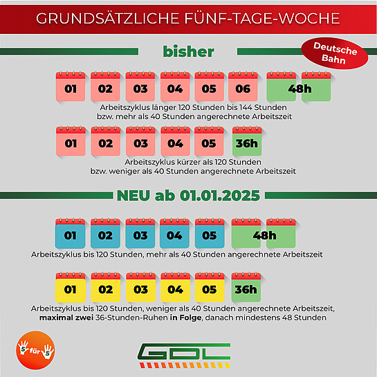 Mit der grundsätzlichen Fünf-Tage-Woche ergibt sich nicht nur ein Arbeitszyklus von höchstens 120 Stunden. Auch die Aufwertung der Ruhetage von 36 auf 48 Stunden sorgt ab 01.01.2025 für mehr Erholmöglichkeit.